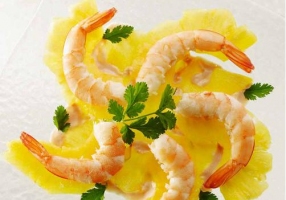 - Alterner crevettes et ananas et accompagner de la sauce.