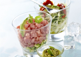 - Dans les verres de présentation répartissez l'avocat puis les courgettes, versez la sauce aux deux huiles, ajoutez la viande, versez un filet d'huile d'olive et décorez avec les pétales de tomates confites.