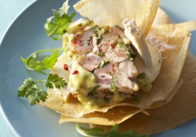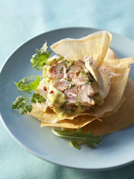 - Découpez les feuilles de brick en 16 triangles et faites-les dorer 1 minute au four.