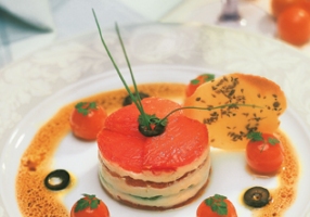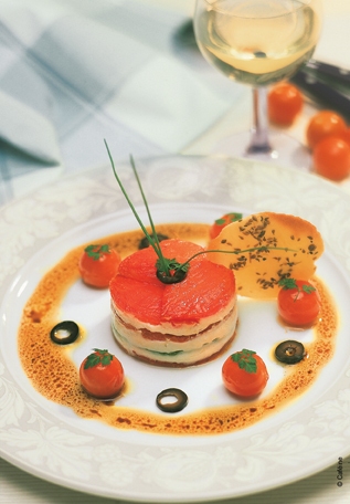 Présentation : intercaler des couches de tomates, de crème de Chavignol et de poivrons confits.