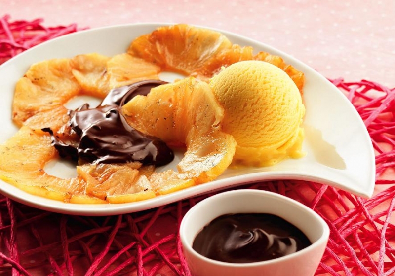 - Disposer l'ananas caramélisé dans des assiettes.