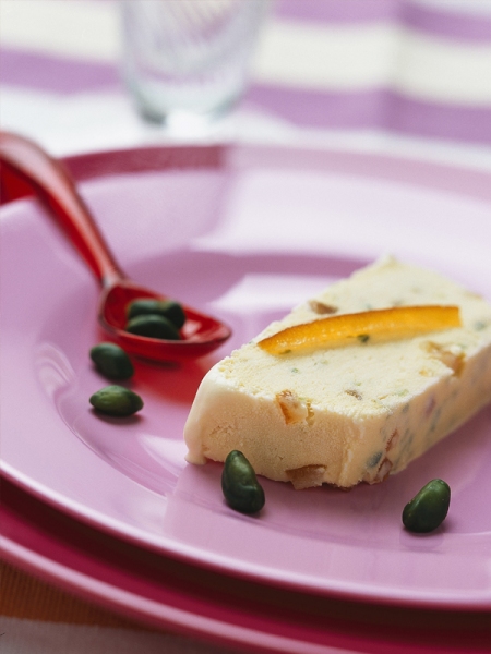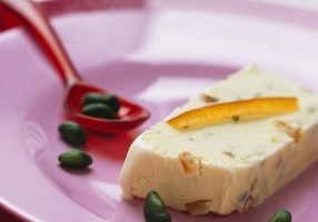 - Fouetter la crème liquide très froide jusqu'à ce qu'elle forme des crêtes. L'incorporer alors très délicatement à la préparation ainsi que les écorces d'oranges et les pistaches.