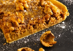 - Saupoudrer la tarte de sucre glace, décorer avec les cerneaux de noix.