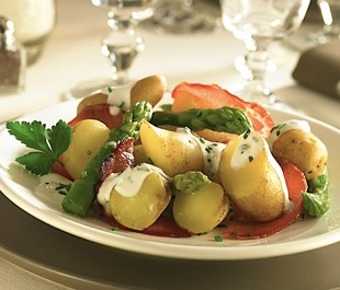 - Ajoutez les petits oignons, les tronçons d'asperge, les champignons et les morceaux de jambon.