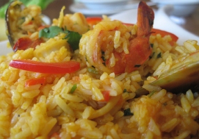 - Ajouter le riz, la saucisse, le jambon, les tomates et le poivron coupé en fines lanières. Â