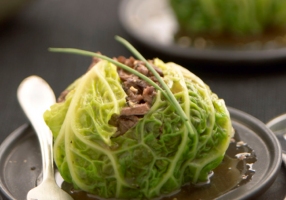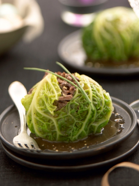 Avant de servir, réchauffez les choux farcis 8 à 10 minutes à la vapeur, retirez délicatement le film et servez avec la sauce bien chaude.