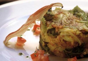 - Présenter le trinxat en timbale en posant la tranche de ventrèche grillée.