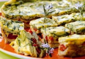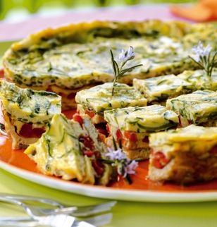 - Disposer dans un plat creux par couches successives : omelette, poivrons, omelette, oignons....