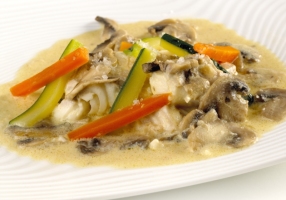 - Déposer le cabillaud, les champignons, les carottes et la courgette dans la cocotte.