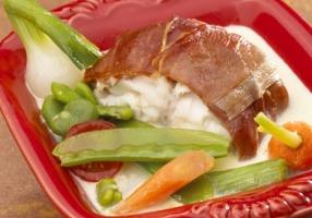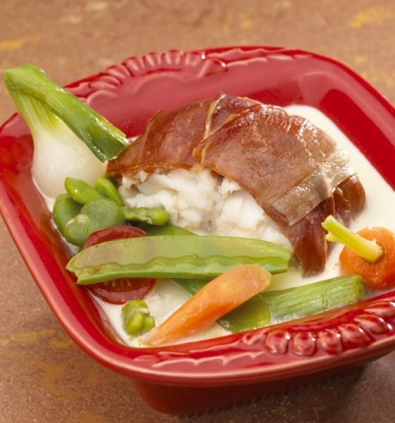 - Envelopper la queue de lotte dans les tranches de jambon. Ficeler.