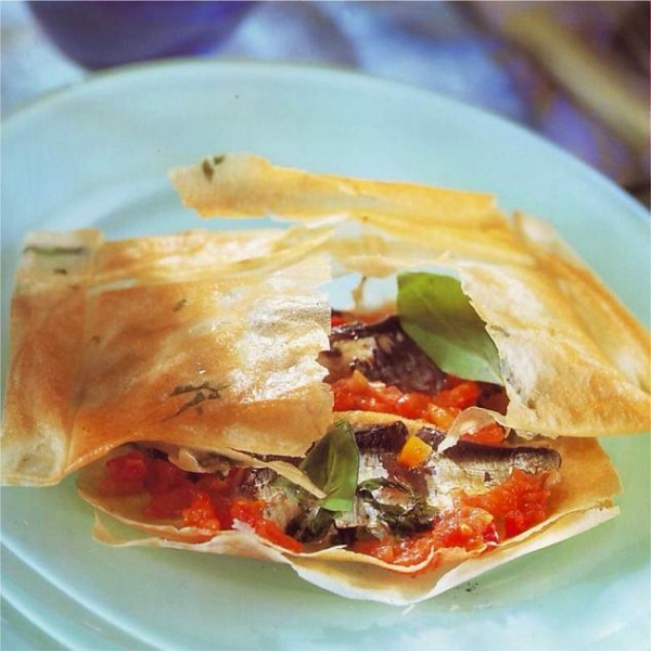 - Poser 1 sardine, un peu de tomate mondée, du basilic et de l'ail hachés.
