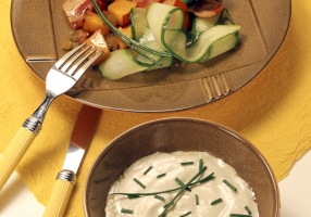 Ou bien avec mâche ou laitue, noisettes, raisins secs, tagliatelles de concombre.