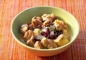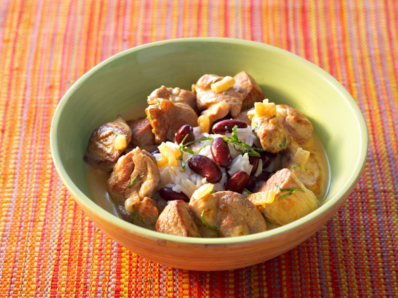 Servir l'agneau coco accompagné de riz blanc et de haricots rouges.