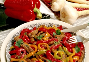 - Dans une sauteuse, chauffer l'huile et faire revnir la viande pendant 2 minutes puis ajouter les poivrons, l'ail, l'oignon et le persil.