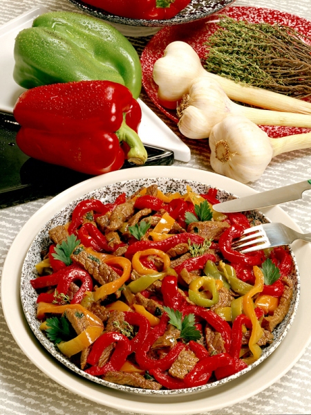 - Laver, égrener puis couper en fines lanières les poivrons.
