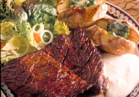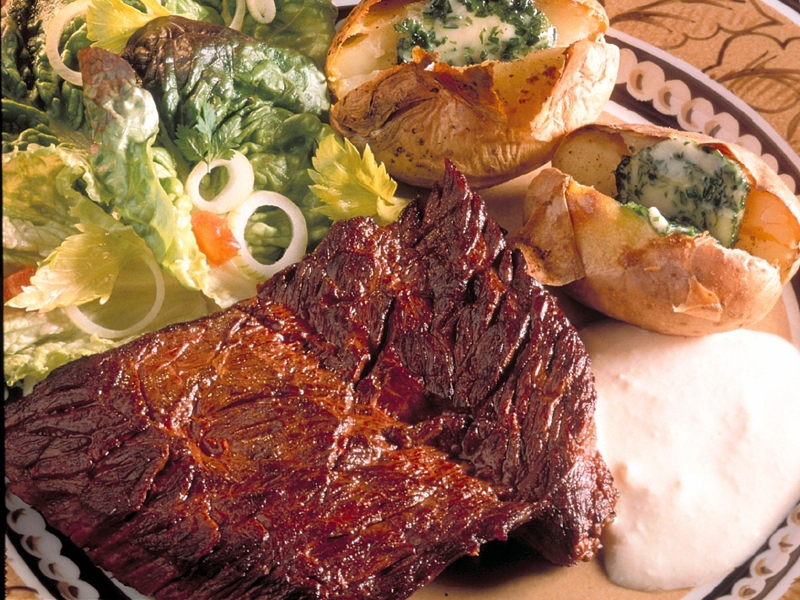Présenter à l'assiette, l'onglet nappé de la sauce avec la pomme de terre.