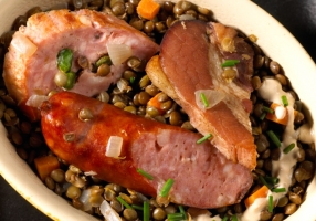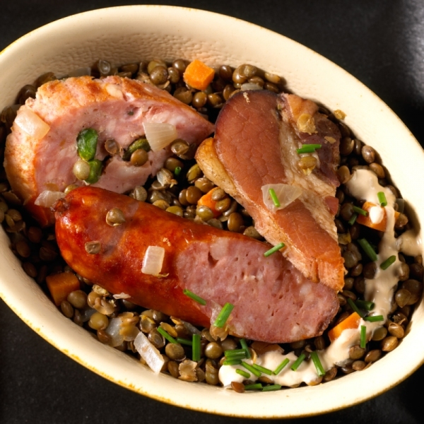- Disposer les lentilles dans un plat, y déposer la charcuterie.