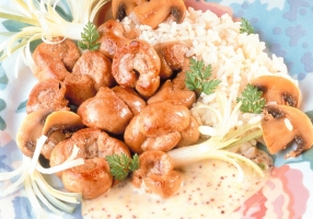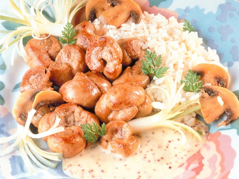 - Dans la sauteuse, ajouter les champignons, la moutarde et la crème, mélanger soigneusement et laisser mijoter encore 3 minutes.