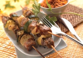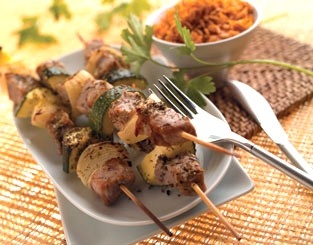 - Préparer les brochettes en alternant morceaux de viande, oignons et courgettes.