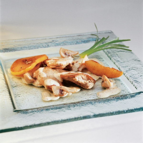 Choisissez un vin blanc sec au palais frais, ample et fruité. La fraîcheur du vin prépare le palais à une dialectique des plus compliquées. Le vin va se plaire avec la viande : il la parfume, elle l’étoffe. Tout se complique avec l’accompagnement : souple et fruité, il dilue la sauce. La pomme renforce l’acidité du vin qui lui renvoie des répliques fruitées et florales. En fond de scène, ses arômes d’agrumes donnent la réplique au thym et au laurier. Ses notes fruitées se détendent dans les sous-bois avec les champignons. Dans votre choix, voyagez entre le Bordelais et la Loire, mais le vin doit être encore dans sa prime jeunesse et servi frais.