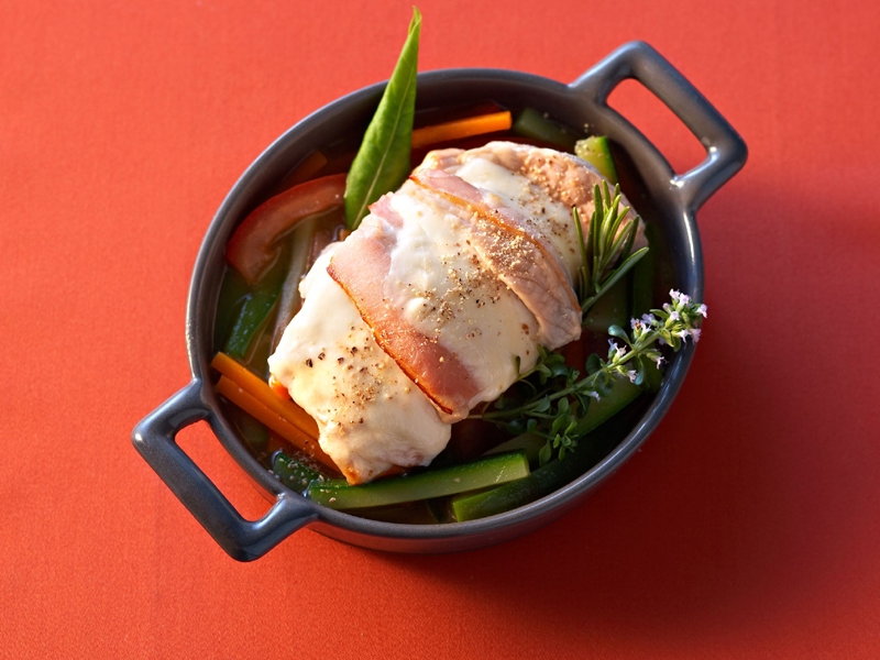 - Entre chaque tranche de viande, intercaler une tranche de mozzarella et une tranche de poitrine de porc puis ficeler le tout pour lui donner la forme d'un rôti.