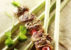 La cuisine d’été est peu exigeante, le vin doit rester estival : et pourtant si vous voulez épater vos convives, servez un vin blanc sec qui apporte le fruité à ce mets tout en montrant une certaine vivacité – Ainsi le « courant » passera. Les arômes fruités et floraux du vin enveloppent la viande, les saveurs d’agrumes dans lesquelles elle a mariné donnent encore plus de vivacité au vin qui se faufile à travers tous les acteurs. Même le poivron n’a pas droit à la parole. Allez chercher un « Chardonnay » bien mûr dans le Sud de la Bourgogne ou en Méditerranée – Des Sauvignons de millésimes chauds seront aussi les bienvenus. Si votre préférence va vers les rosés, qu’ils soient septentrionaux : ils rafraîchiront le palais.