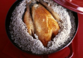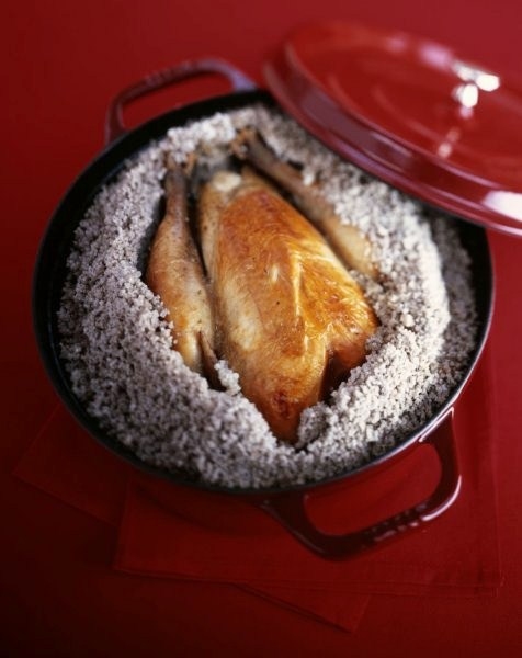 - Faire un lit de gros sel dans un plat allant au four ou une cocotte.