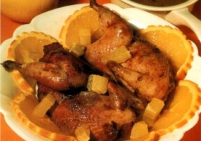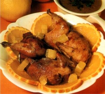 - Présenter les 2 coquelets sur un plat de service chaud, entourés de rondelles d'orange et de cubes de citron.