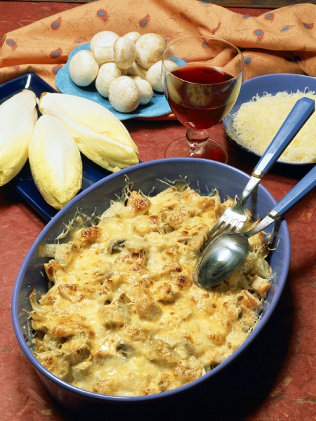 - Dans un plat à gratin, mettre les endives cuites, les champignons et le poulet.