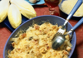 Qu’on se le dise : le vin n’aime pas l’endive : trop d’amertume ! Par la cuisson, cherchez à la faire disparaître. Si vous cherchez l’harmonie ce jour-là, servez un vin blanc sec et solaire de provenance méditerranéenne : entente cordiale entre tous. Si vous jouez la carte de la région, choisissez un vin du Bugey : son acidité donnera un petit coup de pied au mets et rafraîchira le palais – Le poulet s’en sentira d’autant plus ravigoté.