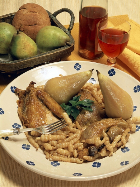 - Peler les poires en conservant la queue et les placer entières, à mi-cuisson, autour de la pintade.